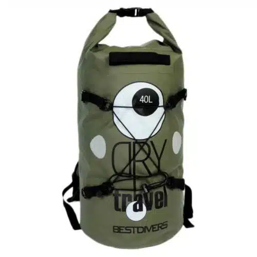 Bolsa impermeable de PVC de 40 litros de capacidad diseñada para almacenar y transportar tu equipo de pesca submarina a la espalda con la máxima seguridad.