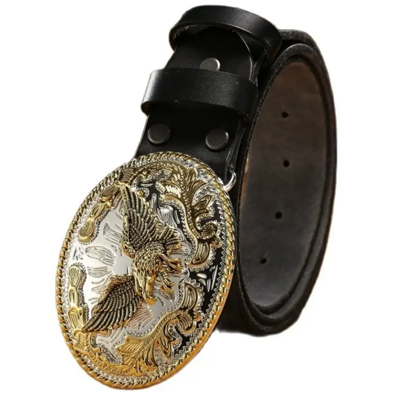 El verdadero protagonista del CINTURÓN RANCHERO es, sin duda, la majestuosa hebilla de águila dorada. Esta magnífica obra de arte captura la elegancia y el poder del águila, un emblema de libertad y fuerza que te hará destacar en cualquier lugar.