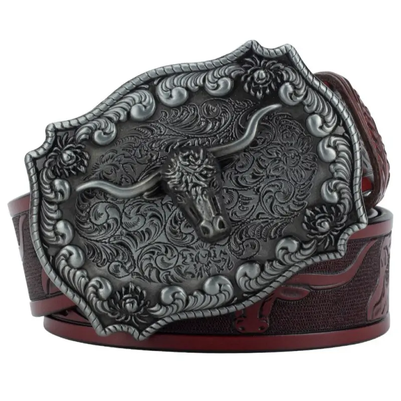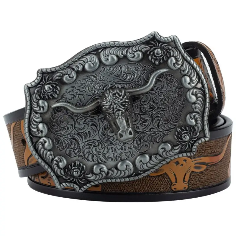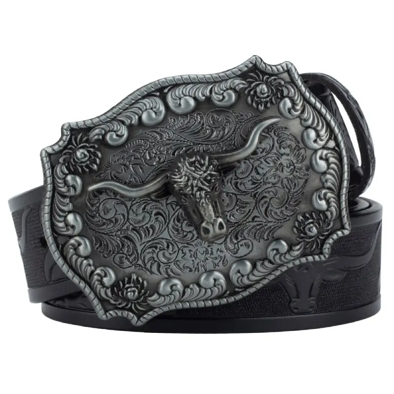 Pero el verdadero atractivo de este cinturón reside en su hebilla, que lleva grabada una impresionante calavera de toro, que evoca la fuerza y la libertad de la cultura Tejana. Este detalle único y llamativo confiere al cinturón un carácter atrevido y un aire de autenticidad.