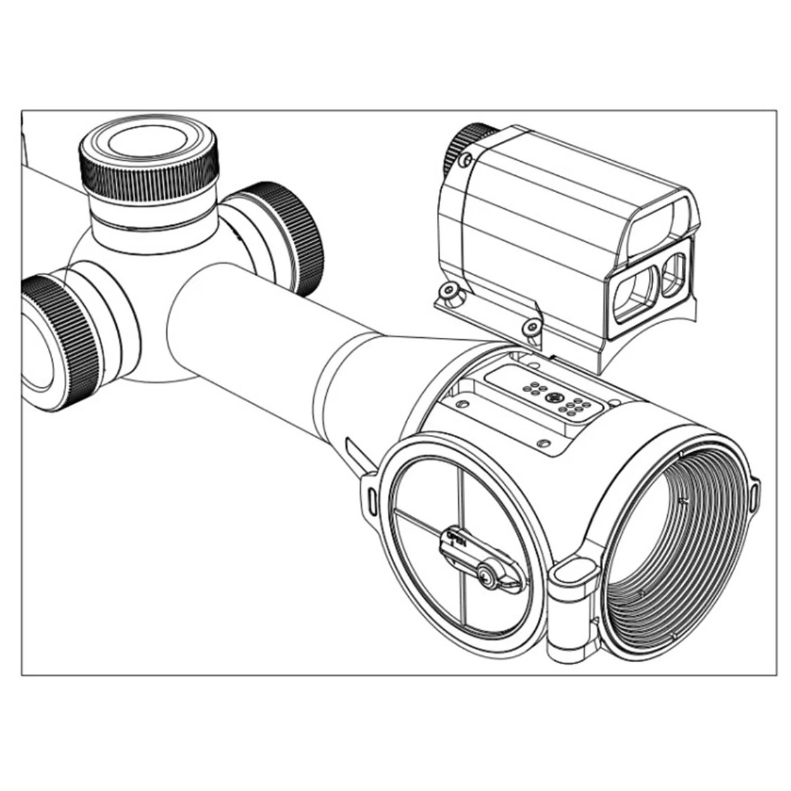 - Telémetro láser (LRF) y calculadora balística; El módulo LRF opcional detecta hasta 1000 m / 1200 yd y la calculadora balística ajusta el punto de impacto en tiempo real, teniendo en cuenta la distancia, temperatura y munición.