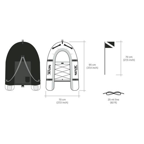 Viene con 3 cámaras de aire independientes con tapones reforzados para garantizar la mayor seguridad, una bandera de señalización en la proa y 25 metros de cabo.