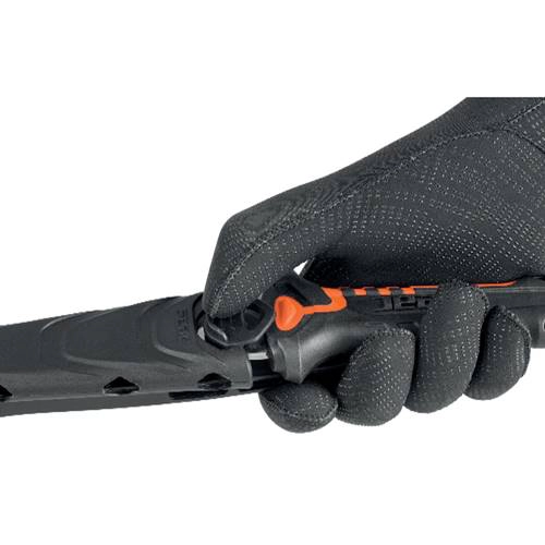 El agarre es anatómico y la cuchilla presenta un filo afilado y un filo dentado, además de una muesca para cortar cabos.