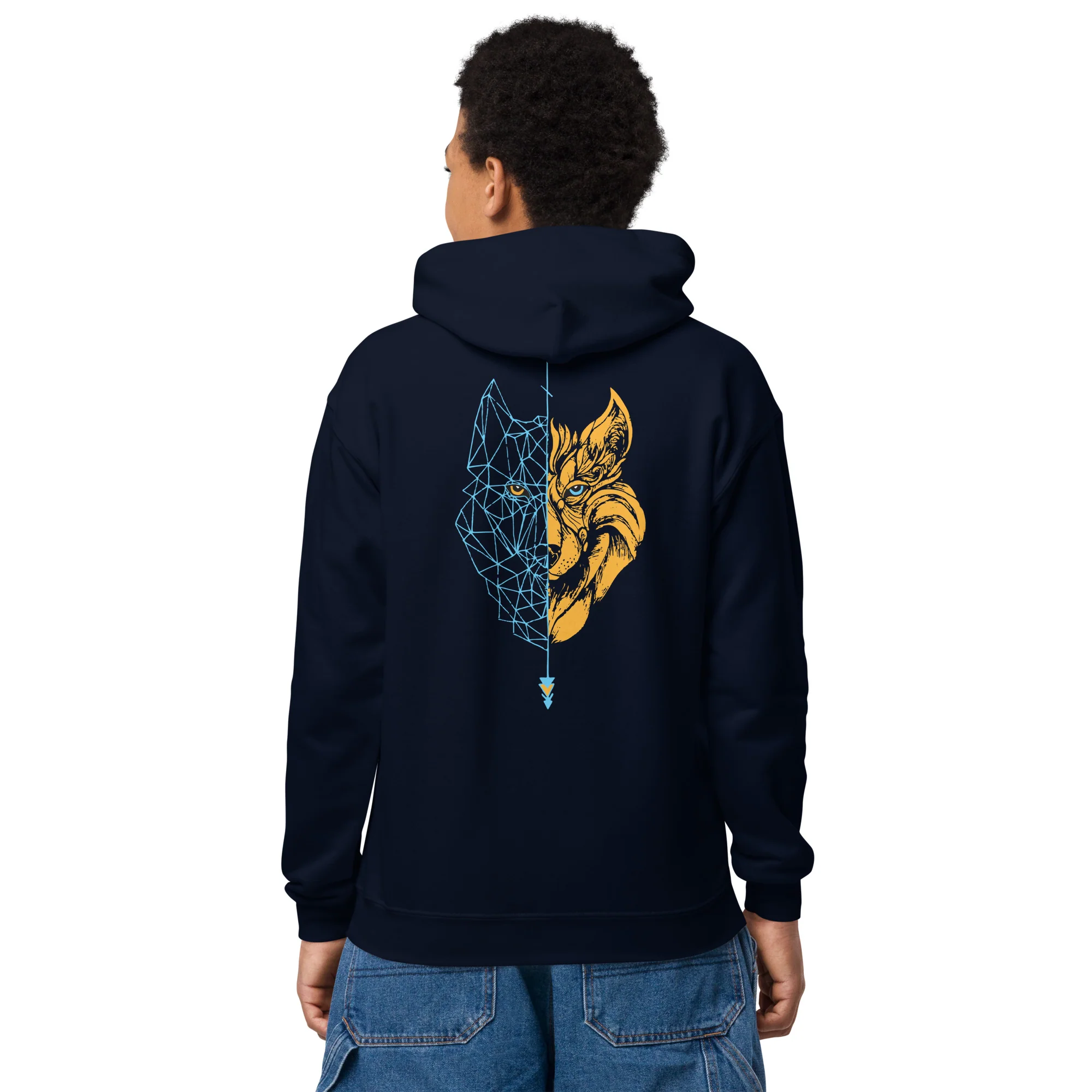 Esta sudadera con capucha presenta el diseño del Lobo Azul y Naranja, listo para acompañar cualquier tipo de aventura: desde carreras por el parque hasta expediciones por el salón. Hecha con tejido polar de grosor medio, capucha doble sin cordones y un bolsillo canguro para los objetos más imprescindibles (o más aleatorios).